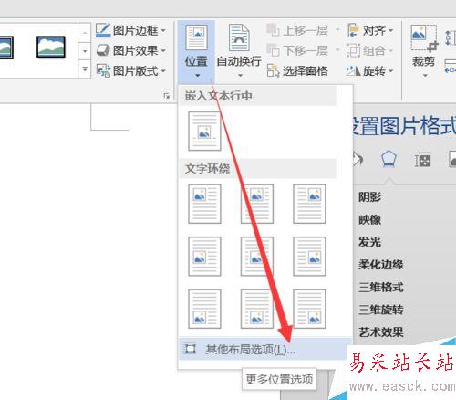 3、接下來輸入一段文字,同時將圖片的“對齊方式”設置“浮于文字之上”。選中圖片,切換到“格式”選項卡,點擊“位置”下拉列表,從中選擇“其它布局選項”按鈕。