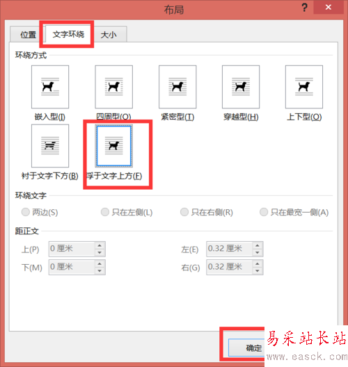 4、在打開的“布局”窗口中,切換到“文字環繞”選項卡,選中“浮于文字上方”項,點擊“確定”即可。