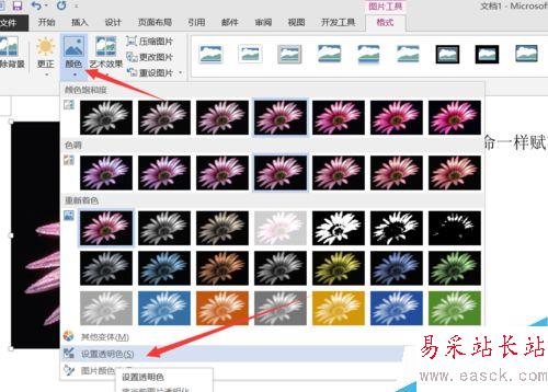 5、接下來切換到“格式”選項卡,點擊“調整 顏色”下拉列表,選擇“設置透明色”項。