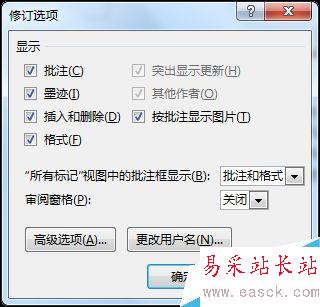 5、打開”修訂選項“對話框,可對顯示選項進行設置,如下圖。