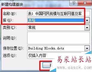 3、打開“新建構建基塊”對話框,設置名稱,并在庫類別下拉框中選擇“表格”,單擊確定,這個表格的部件已保存好了;