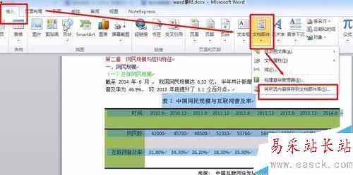 1、在下圖所示的文檔中,中國網民規模與互聯網普及率這個表格很有可能在撰寫其他文檔時會再次用到,所以這里我們將它以表格部件的形式保存起來;