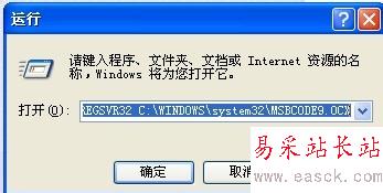 4、打開運行對話框,輸入:REGSVR32 C:/WINDOWS/system32/MSBCODE9.OCX,對這個文件進行注冊,這樣才能使用。打開“運行”對話框的快捷鍵:WIN+R。