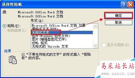 9、在打開的“選擇性粘貼”對話框,在“形式”中選擇“無格式文本”,然后單擊“確定”。