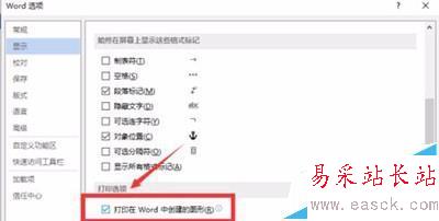 7、在顯示選項卡的右側窗格中,找到打印選項區域下的“打印在 Word 中創建的圖形”選項并將其勾選“√”,最后點擊“確定”按鈕。