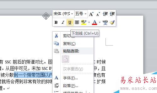 第一種:您可以在您選中的文字上點擊右鍵,出現(xiàn)如下圖所示菜單,選擇上方的“U”即可
