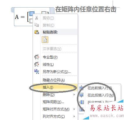 5、但是需要插入的是4×5的矩陣。這時只需要右擊矩陣內(nèi)任意黑色虛線方框,在彈出的菜單的“插入”下級菜單中,選擇任意“插入行”2次,任意“插入列”3次。