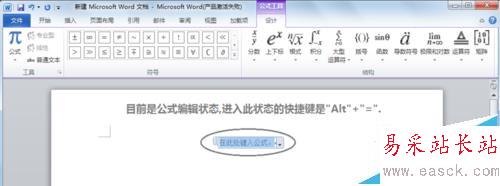 3、可以看到,當點擊了“公式”后,進入到了公式編輯的狀態(tài)。(使用“Alt”+“=”快捷鍵可直接進入此界面)