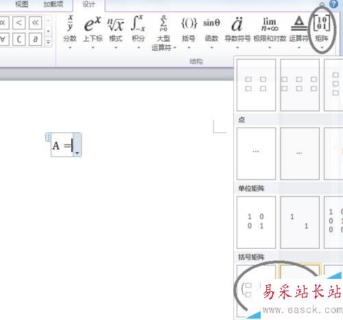 4、以簡介圖片的矩陣為例。在公式編輯狀態(tài)下,先輸入“A=”,然后選擇“矩陣”里的“括號矩陣”,這時可以看到公式編輯欄中已經(jīng)插入了一個2×2的矩陣。