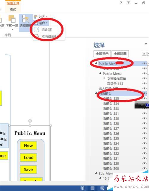9、也可以通過組合圖形來方便形狀管理。如圖選擇多個需要被組合的窗格,點擊頂部的組合鍵即可進行組合管理