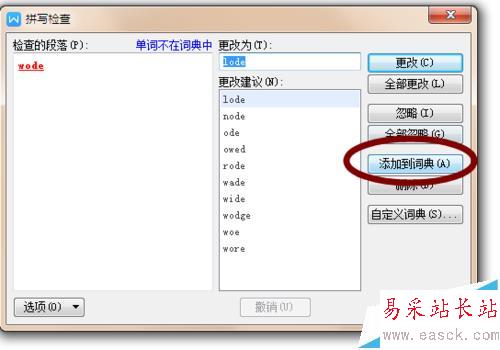 5、另外如果對于一些自創的或者較偏的英文單詞,詞典讀不出來,但是顯示紅色波浪線,這時候我們可以自定義詞典,選中單詞,執行”審閱——拼寫檢查”,然后出現的對話框中,我們點擊“添加到詞典”,如圖