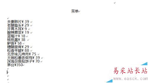 1、以飯店菜單為例,先鍵入需編輯的所有文字。如下圖所示。
