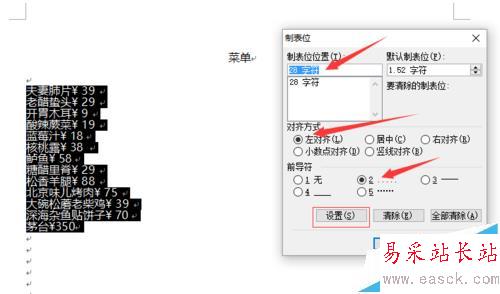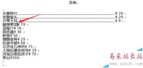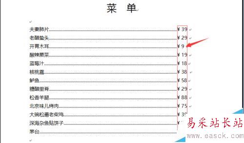 6、其它設(shè)置:編輯后的菜單文檔因價(jià)格位數(shù)不一致,造成價(jià)格沒有右對齊,如下圖1所示。此情況在設(shè)置制表位時(shí)可以采取右對齊方式,編輯后如下圖2所示。價(jià)格上若有分位數(shù),則通常選擇小數(shù)點(diǎn)為對齊方式,如下圖3所示。(以下圖片從上到下為圖1、圖2、圖3)
