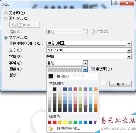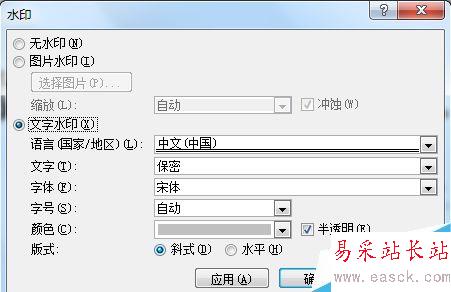 在進入word水印文字功能后,在文字一欄中,可以編輯需要添加的文字水印了,以及word水印文字的顏色等。