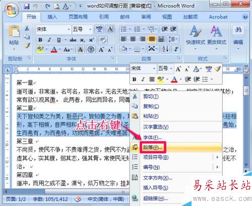 2、然后在選中的文本上單擊鼠標(biāo)右鍵,選擇段落。