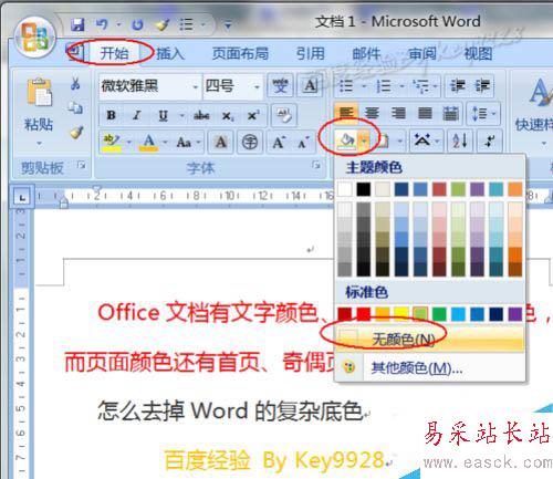 10、再單擊“開始”選項卡下的“底紋”,從彈出面板中選擇“無顏色”: