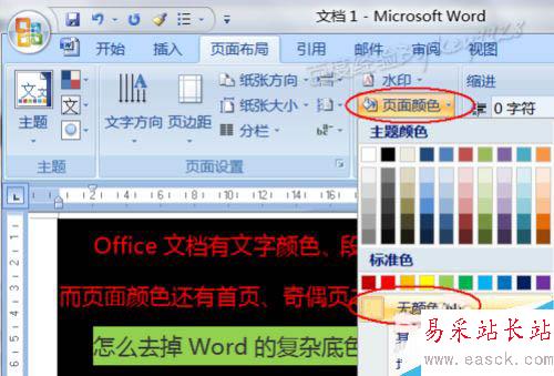 3、然后,再點擊“頁面布局”選項卡中的“頁面顏色”按鈕,從彈出的顏色面板中選擇“無顏色”即可: