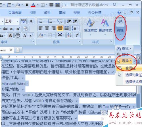 此時可以全選所有需要設置首先縮進的段落,一般所有段落都需要首行縮進的,所以可以按CTRL+A鍵全選:
