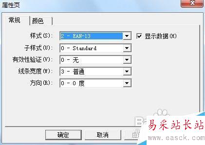 6、在常規選項卡, 我們可設置條形碼的樣式、子樣式,有效性驗證,線條寬度和方向, 我們可以通過下拉列表進行選擇;在右邊的“顯示數據”復選框中勾選或去掉勾可以設置條形碼中是否顯示數據;