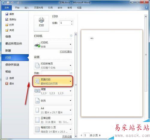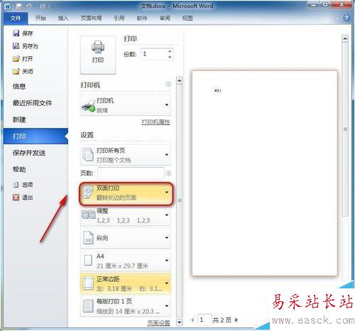 4、選擇“雙面打印-翻轉長邊的頁面”