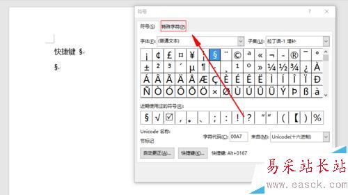 4、在眾多的特殊字符中,你會發現這個“§”字符,細心的你會發現word后面的快捷鍵并未設置