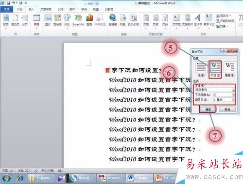 4、彈出【首字下沉】菜單,選中【下沉】按鈕,然后設置【選項】組中的參數,包括【字體】、【下沉行數】和【距正文】,最后點擊【確定】。