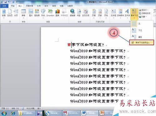 3、彈出首字下沉下拉菜單,選擇【首字下沉選項】。