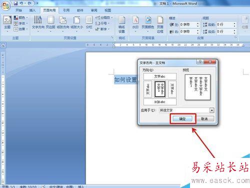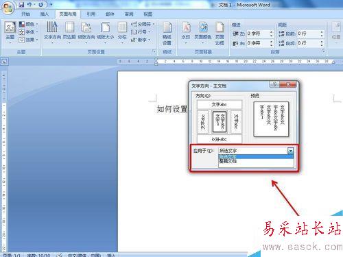 5、選擇方向后,點(diǎn)擊“應(yīng)用于”右邊的下拉三角形,在下拉菜單中,選擇應(yīng)用于“所選文字”或“整篇文檔”