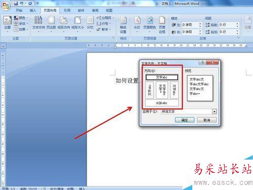 4、在彈出的“文字方向-主文檔”對(duì)話框中的方向欄,選擇需要設(shè)置的文字方向,如“豎版”等等