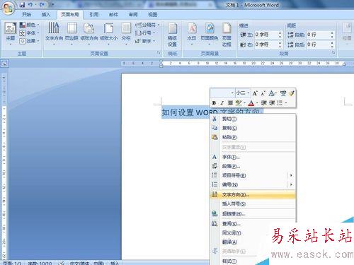 7、也可以在用鼠標(biāo)選中文字后,點(diǎn)擊鼠標(biāo)右鍵,在彈出的菜單中,選擇“文字方向”來(lái)進(jìn)行設(shè)置。