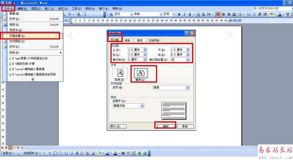 1、以word2003為例進行說明,打開word2003后,首先要設置讀書小報的紙張大小。點擊文件——頁面設置——頁邊距——頁邊距上下左右都設置為1.5厘米,方向就設置為:橫向——點擊確定。