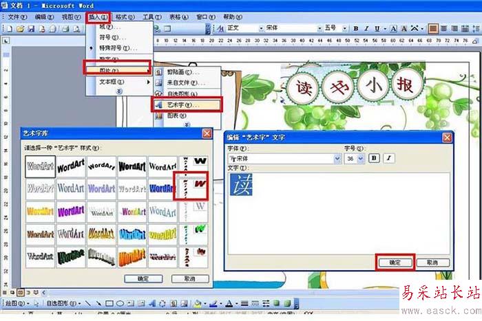 4、設置小報主題。點擊插入——圖片——藝術字——選擇一種藝術類型輸入文字,如這里分別寫上讀書小報四個藝術字擺放在四個小圓那里。