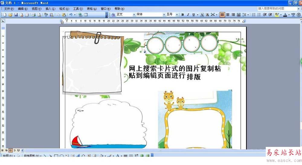 3、在網上搜索一些卡片樣式和圖片,然后復制粘貼到小報界面那里,也可以自己編輯好圖片插入到word那里進行排版布局。