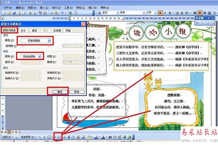5、輸入小報的讀書內容:點擊橫排文本框——輸入文字并設置大小居中——雙擊文本框——顏色和線條——填充顏色和線條顏色者設置為:無填充顏色,然后點擊確定。