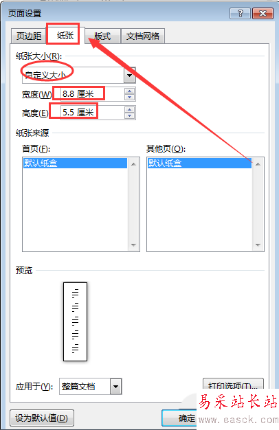 5、然后切換到紙張設(shè)置面板,選擇紙張大小為自定義大小,名片的最合適的高度和寬度分別是8.8厘米和5.5厘米,設(shè)置好后點擊確定。