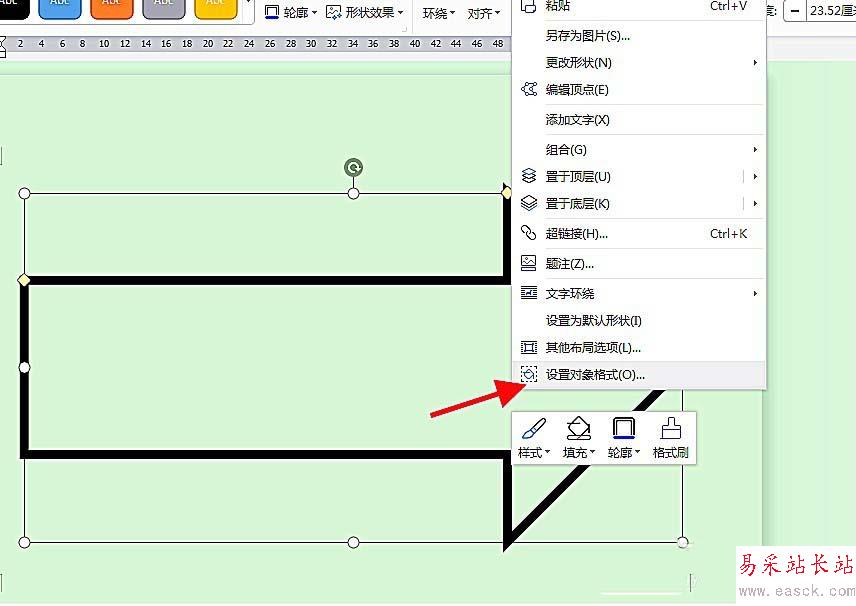 3、如圖在空白處畫出箭頭形狀,調整箭頭位置及大小,選中箭頭標識,右鍵選擇“設置對象格式”;