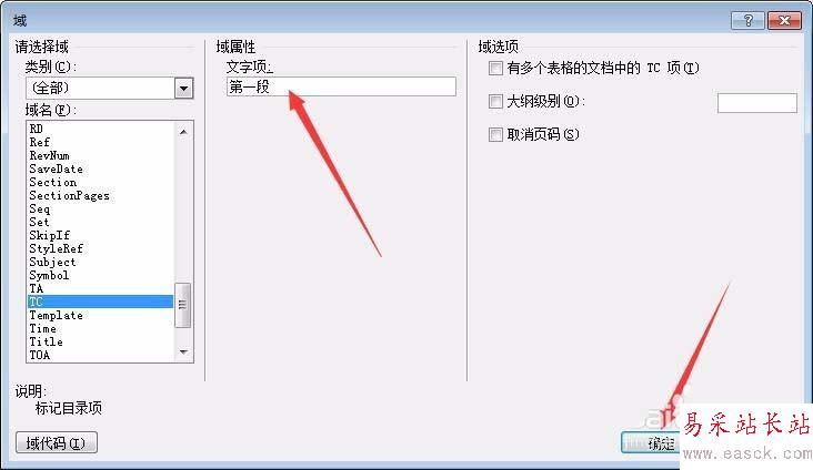 5、在TC域域屬性文字項窗口中,在框中輸入要成為目錄的文字,點擊確定。