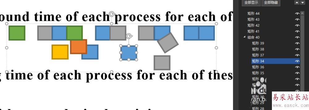1、如圖為例,想要一起縮放這些小正方形,多選選中了他們,縮放卻是各自修改。而想要的效果是作為整體縮放。