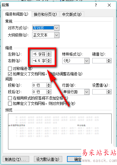 2、此時此刻就進入到了段落的設置頁面,在頁面中找到縮進欄,然后在其下方點擊圖示位置的向下箭頭符號,調整左右縮進至合適值即可。