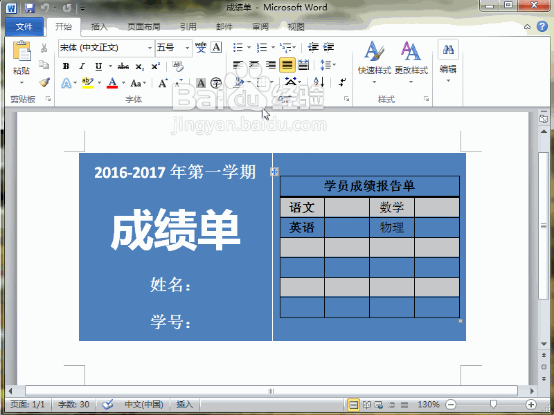 2、接下來,打開Word2010,設(shè)計好成績單的界面。然后點擊郵件選項卡,在開始郵件合并功能區(qū)點擊選擇收件人,在彈出的菜單中點擊使用現(xiàn)有列表。