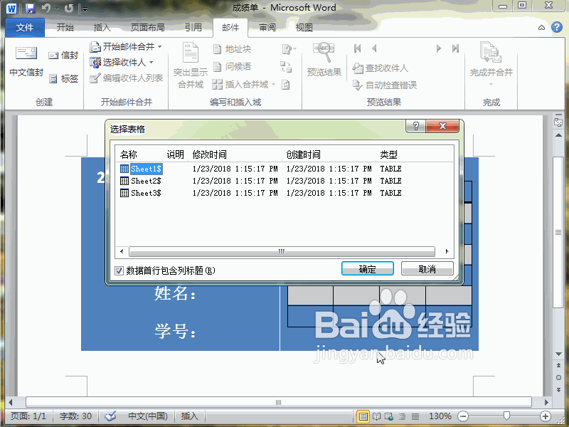 4、彈出選擇表格對話框,點擊選中成績數(shù)據(jù)所在的工作表標(biāo)簽名,再點擊確定按鈕。