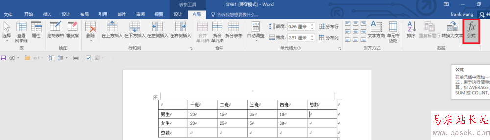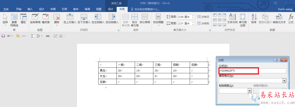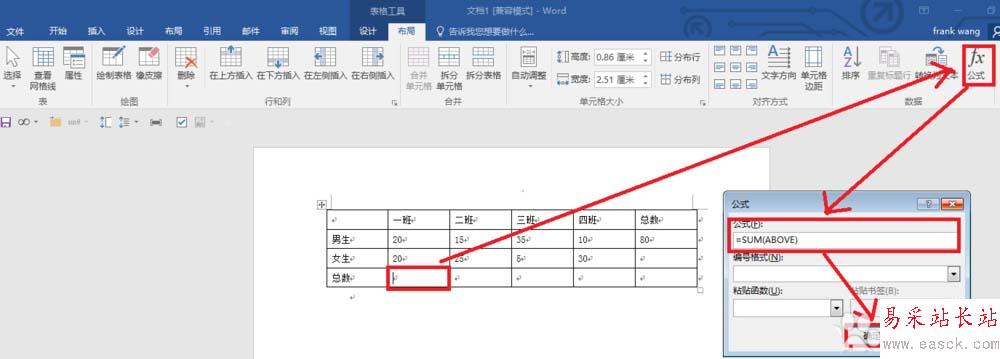 7、將光標定位到下方的單元格,點擊公式,word會智能識別sum的參數是above,如下圖。