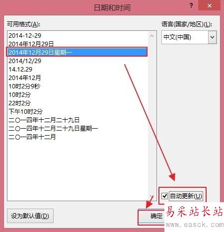2、打開“日期和時間”對話框,在“可用格式”列表框中選擇合適的日期或時間格式,勾選“自動更新”,然后單擊“確定”。