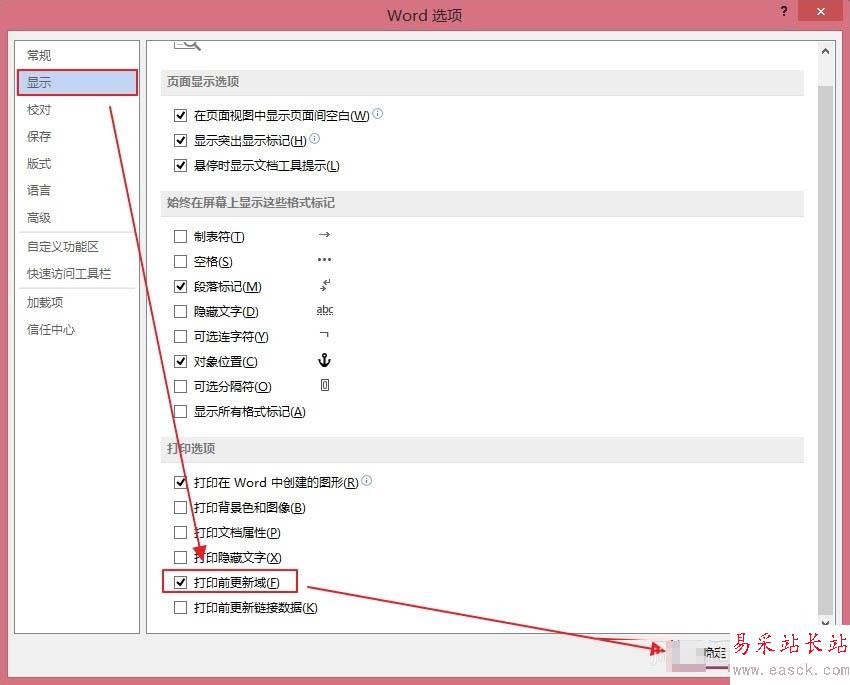 (2)打開“Word選項”對話框,在“顯示”選項中將“打印前更新域”復選框勾選,然后單擊“確定”即可。