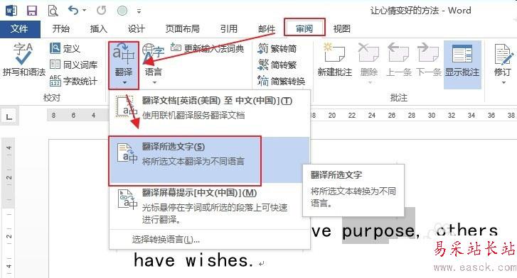 (2)在“審閱”選項卡“語言”組單擊“翻譯”,在展開的列表中單擊“翻譯所選文字”。