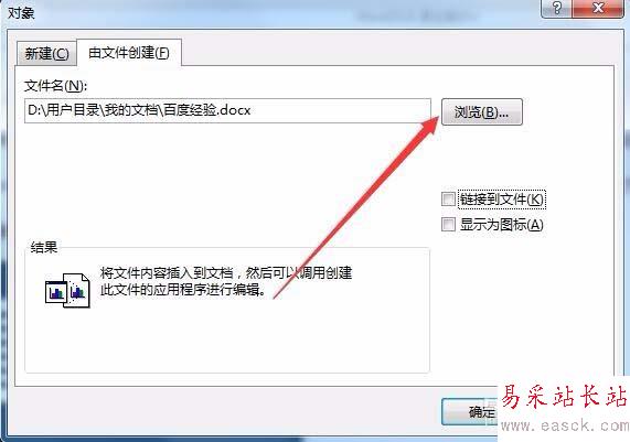 4、在打開的窗口中,點擊“瀏覽”按鈕,來選擇要插入的附件文檔