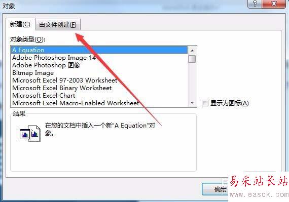 3、這時就會插入對象窗口,點擊窗口上面的“由文件創建”標簽