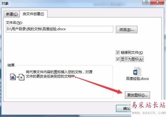 6、如果想更改在插入文檔中附件的圖標,可以點擊下面的“更改圖標”按鈕。