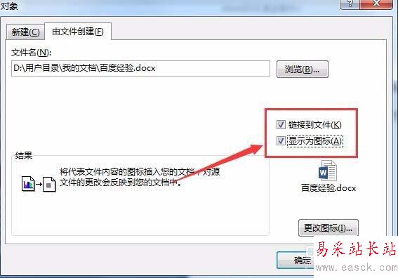 5、接下來可以選中“鏈接到文件”與“顯示為圖標”兩個復選框,這樣附件就會以圖標的顯示在Word文檔中顯示了,同時點擊后會快速打開附件的文檔。