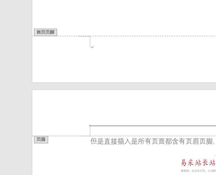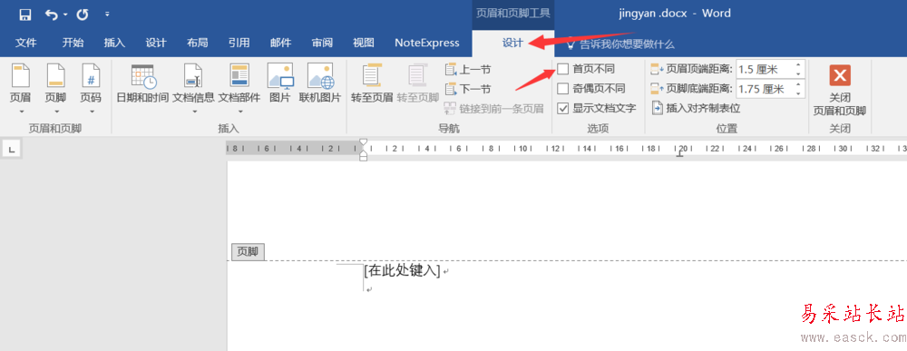 2、頁腳出現后是所有的頁腳頁眉都是一樣的,此時選擇設計,在設計菜單中勾選首頁不同